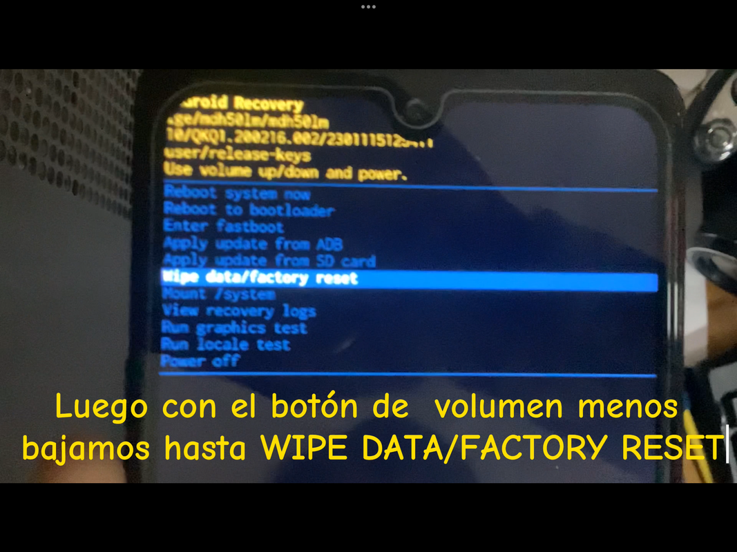 4. Bajar con el botón de volumen menos hasta WIPE FACTORY RESET Y PULSAMOS EL BOTON DE APAGADO PARA ACEPTAR.