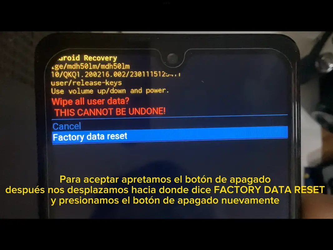 5. Luego bajamos otra vez y aceptamos en FACTORY DATA RESET.